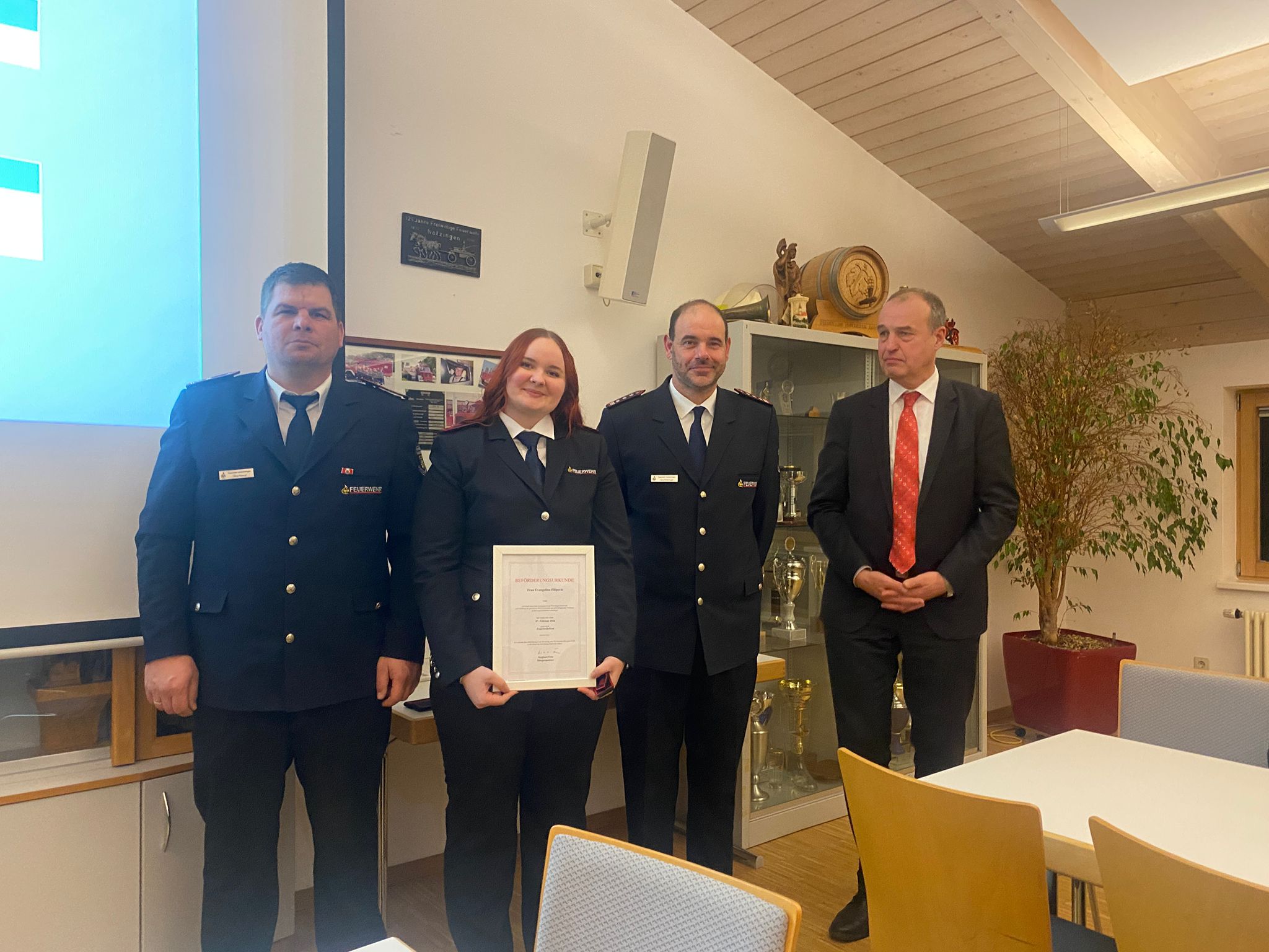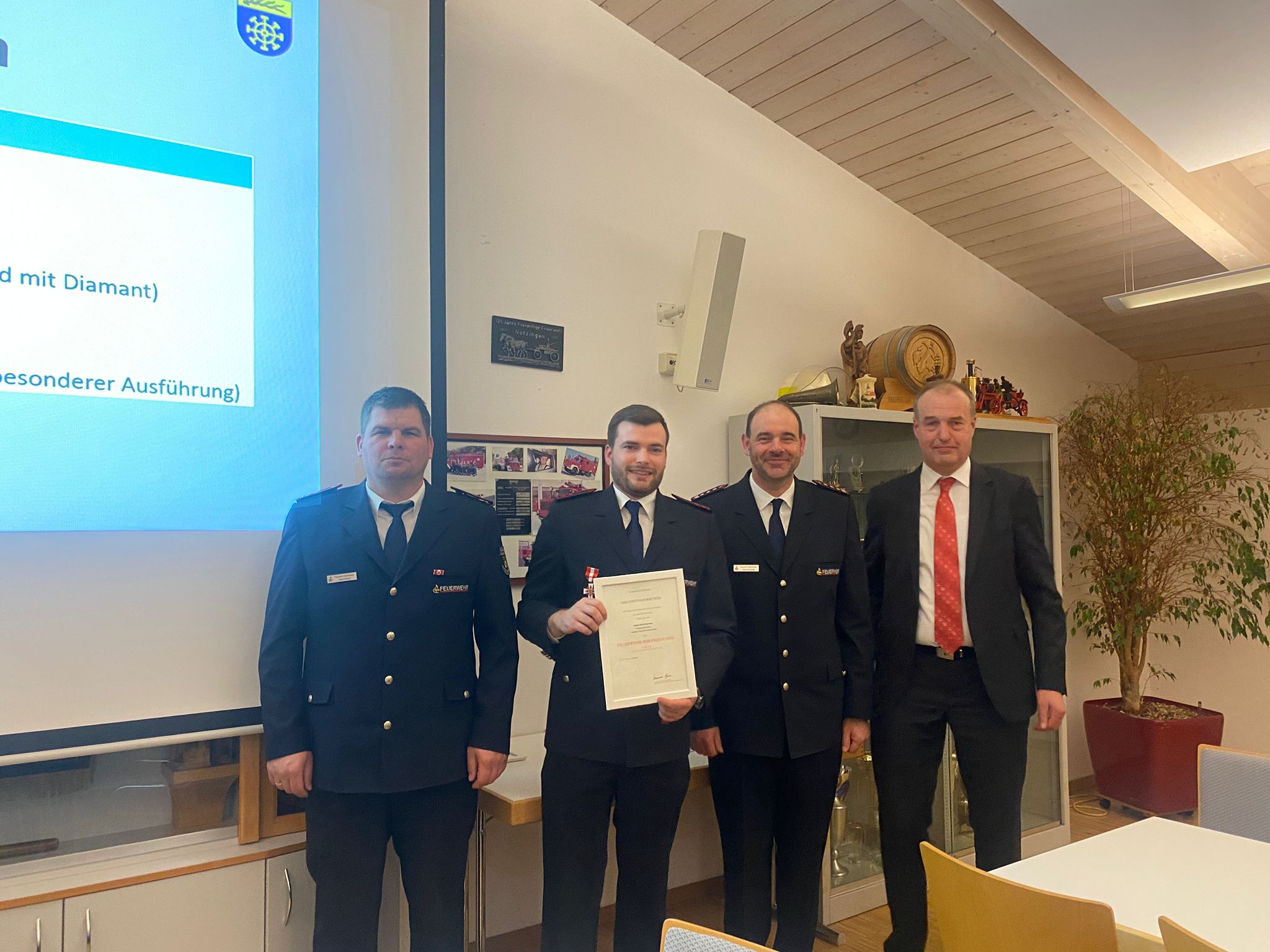 Ein besonderer Höhepunkt des Abends waren die Ehrungen und Beförderungen. Lukas Holder wurde per Handschlag in die aktive Wehr aufgenommen. Evangelia Filipovic wurde zur Feuerwehrfrau befördert, Dirk Eisinger zum Hauptfeuerwehrmann. Für langjährige Mitgliedschaft wurden Nick Eschen (15 Jahre), Michaela Lehner (20 Jahre), Alexander Bunz (30 Jahre als Stabführer, Dirigentennadel in Gold mit Diamant), Jürgen Brenner (40 Jahre, Gold) sowie Jürgen Frieß (50 Jahre, Ehrenzeichen in Gold in besonderer Ausführung) geehrt.