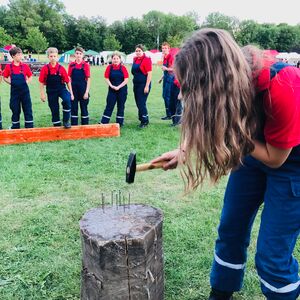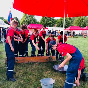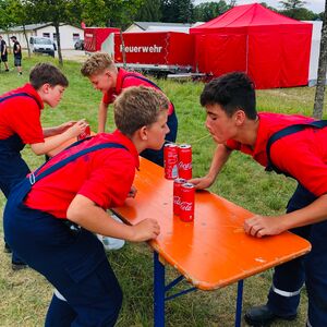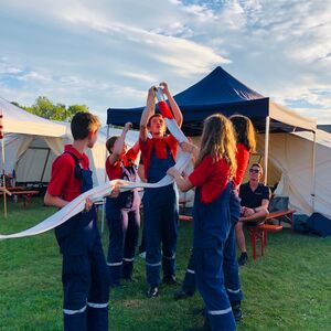 Nach dem erfolgreichen Zeltaufbau am Freitagmittag und einem folgenden Abendessen, startete direkt die Lagerrallye. 32 Aufgaben wie Stiefelweitwurf, Bobby Car rennen und „wer kann die meisten Feuerwehrknoten" mussten bewältigt werden.