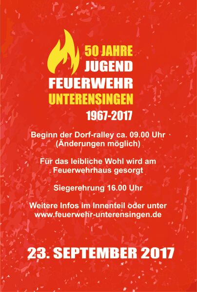 Die Jugendfeuerwehr wurde 1967 gegründet und ist nun 50 Jahre alt. Dieses Jubiläum feierten wir am 22.07.2017 in Verbindung mit unserem Tag der offenen Tür. Des weiteren wurde am 23.09.2017 eine Dorf-Ralley rund um das Feuerwehrhaus und durch ganz Unterensingen veranstaltet.